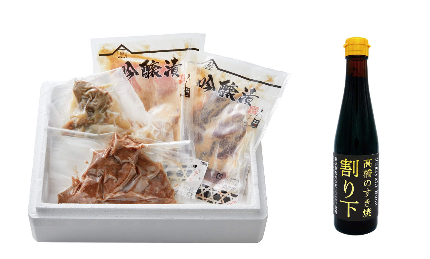 蔵王牛味付け肉100g、国産味付け鶏もも肉80g、とろとろ牛すじ100g、グリル焼き牛すじ100g、高橋のすき焼き割り下300ml