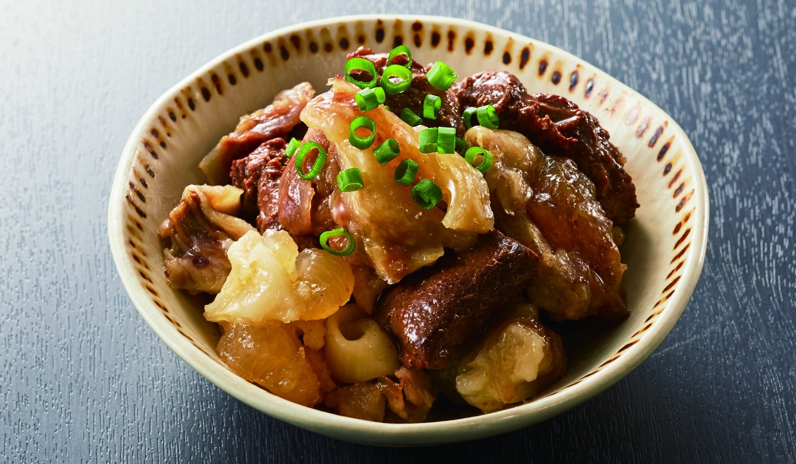 ④すべての具材に火が通ったらボイル牛すじ肉を投入する。